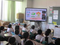 現在、2年生と3年生に給食の栄養教諭の実習生がきています。本日は、2年生の実習生の「やさいのひみつ」についてのお話を聞きにいきました。まずは、本校の栄養教諭の話から始まり、実習生へ・・・