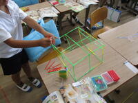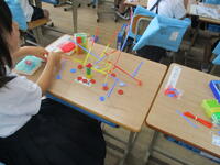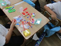 身の回りにある材料に十分に慣れるとともに、並べたり、つないだり、積んだりするなど手や体全体の感覚などを働かせながら、工夫してつくる学習です。へびのように長くならべる子や家のように組み立てる子など、豊かな発想で取り組むことができました。(校長 佐藤 政臣)