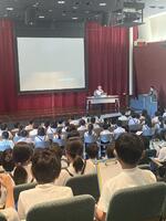 最後は、1億円のレプリカを手に持って、その重さにみんな驚いていました。(主幹教諭;下山)