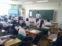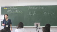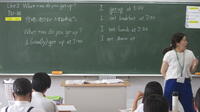 外国語の授業では、「時刻の表現」についての学習でした。学習活動で、就寝時刻を挙手で日髙教諭が確認。