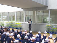 開会の言葉の後に、児童代表発表、校長講話、プール使用のきまり・諸注意、準備運動を中庭に行った後に、プールに移動しました。校長講話では、「①しっかり先生の話を聞くこと、②プールでのきまりを守ること、③命にかかわること」についてお話ししました。水が平気な子、恐怖心がある子など、個人差があるようです。まずは、水とお友達になることが大切です。ご家庭でも水慣れの遊びなどよろしくお願いいたします。(校長 佐藤 政臣)