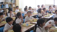お隣のクラスを覗いてみると、実習生ではありませんが、先生が、無言掃除の話をしながら、みんなと給食を食べていました。