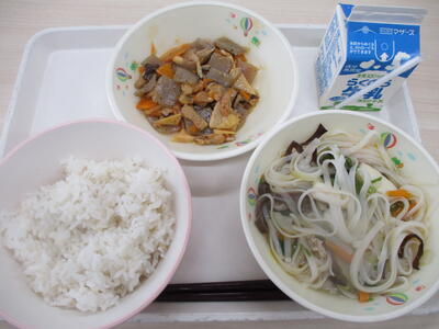 三色ご飯、牛乳、けんちん汁、わかめのごまだれ和え