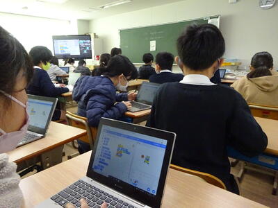 5年生は、5・6時間目にプログラミング教室を行いました。今回は、熊本日日新聞社の小中学生新聞「くまTOMO」の「ぷれすけとプログラミングDX」の連載で協力をされている熊本高等専門学校の藤井慶准教授を講師に実施しました。感染防止対策のため、急きょ、少人数教室と5年生教室をオンラインでつないでのプログラミング教室となりました。 熊本高専職員と熊日の方々が少人数教室を配信拠点に環境整備され、事前に子どもたちにもテキストをタブレットに送付するなど、まさしくICTを活用したプログラミング教室となりました。
