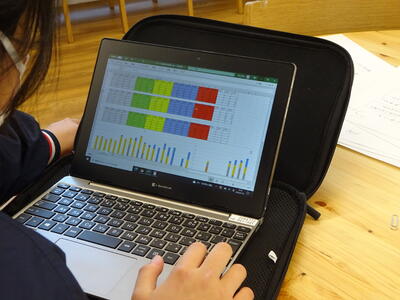 昼休みの図書室で何やら作業をしている図書委員の5年生が2人。図書委員会で昨年末に全児童にとったアンケートの整理をしていました。1人がアンケートを項目ごと仕分け、もう1人がPCに入力作業と段取りよく700枚近くのアンケート集計をしていました。集計表もエクセルで自作をしたとのことで、グラフ化もされています。「正」を書きながら数えていた世代からすると驚きです。このように授業以外でも子どもたちがタブレットを使っている場面が多く見見られます。子どもたちにとってもタブレットが日常化してきているなと感じます。