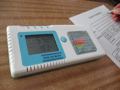 学校保健安全法に基づいて、教室等の環境衛生検査(換気、保温、採光、照明、騒音など)を行っています。昨日(18日)は、換気の状態を学校薬剤師の椎屋久生先生に二酸化炭素濃度の測定をしてもらいました。いずれも基準値以下の結果で、学校環境衛生基準をみたしており、十分換気ができている状態でした。