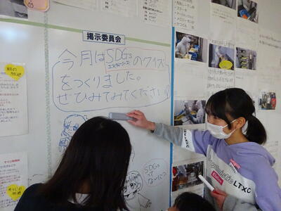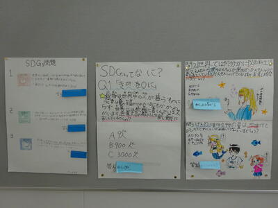 掲示委員会では、校内全体の掲示に取り組んでくれています。前回は、運動会の記事を作成して掲示をしてくれていましたが、今回は、最近よく見聞きするようになった「SDGs」(時速可能な開発目標)に関する掲示です。SDGsには17の国際目標がありますが、その中からいくつかの目標についてクイズ形式での啓発をしてくれています。「4 質の高い教育と福祉を」の目標では、「世界の小学校に行く年齢5900万人が小学校に通えていません。一番多い地域はとこでしょう。 ①南アジア ②サハラ以南のアフリカ ③アメリカ)のクイズです。