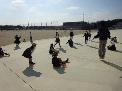 2年生は体育の授業で縄跳びを行っていますが、休み時間や昼休みには、多くの子どもたちが校舎の教室前で縄跳びをしています。日ごと上達していて、回数が多くなったり、跳ぶ速さが早くなったり、二重跳びができたりとそれぞれのペースで縄跳びを楽しんでいます。持久力のつき、体力アップもできる縄跳びでしっかり運動することで感染症対策にもつながります。