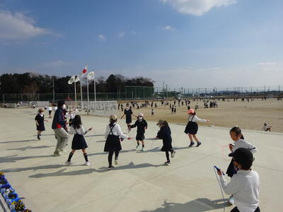 その後、1年生は蜘蛛の子を散らすように走って逃げていきます。それを優しくペースを合わせて追いかけていく6年生のお兄ちゃんお姉ちゃん達。頼れる6年生です。あと2か月あまりで卒業、中学生になると思うと小学校としてはさみしくなります。