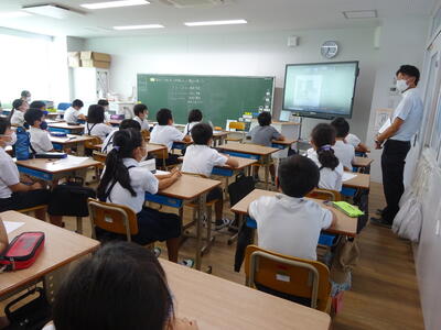 引き続き、14時30分からは、楓の森中学校でオンライン授業(下の写真)があり、小学校職員も参観をさせてもらいました。
