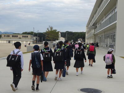 中学校でも中間服や冬服で登校する生徒も見られ始めています。中学2年生は分離元の制服ですが、中学1年生は本校のブレザータイプの制服となっています。小学生も半袖に1枚羽織っての登校が見られています。