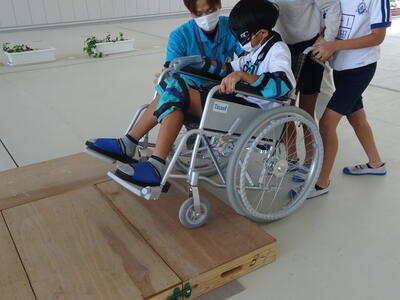 実際に車椅子にのっての体験では、段差を上る時に思わず「こわい!!」と声がでるなど、車椅子を使っている方の気持ちを感覚として理解することができていたようです。
