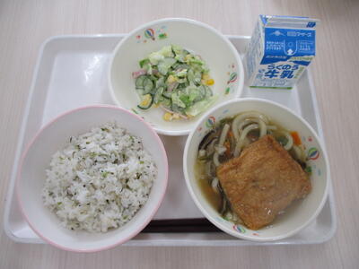 いりこなめし、牛乳、きつねうどん、味噌マヨネーズサラダ
