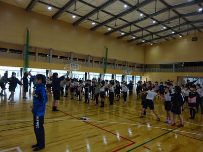 おわかれ遠足前に、体育館で6年生と各学年のおわかれ会を行いました。1年生から5年生まで卒業のお祝いのダンスや言葉、そして寄せ書きなどを6年生に贈りました。6年生は、低学年のかわいいおどりに笑顔になり、3年生のマツケンサンバを一緒に踊り、4年生からの6年生への思いを込めたネタに笑いをもらい、5年生のダンスに合わせた6年生へのメッセージに安心(次を任せられる!)していました。