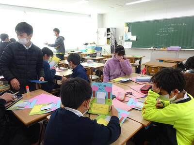 6年生が卒業に向けて取り組んでいる卒業プロジェクトが着々と進んでいます。各クラスを3つのチームに分け、週に1回それぞれのプロジェクトに取り組んでいます。「卒業式実行チーム」は、卒業式でのお別れの言葉を考えたり、卒業式での歌の練習などについて取り組んでいます。「ありがとうチームA」は、学校のためになること、友達への感謝を形にすることに取り組んでいます。「ありがとうチームB」は、在校生へのメッセージ、先生や地域の方々への感謝を形にすることに取り組んでいます。教科(国語、家庭科、図工など)で身につけた技能やタブレットなどを活用して、6年生の主体的な活動の姿が随所に見られます。