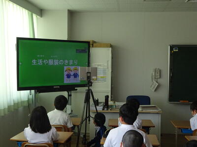 これまでオンラインでの始業式等を行っていましたが、初めてオンライン全校集会を行いました。今回は、学校生活についての確認を担当の先生方からお話をしてもらいました。内容は、①学校での1日のながれ ②生活や服装のきまり ③学習のはなし ④給食の時間の過ごし方 ⑤あそび場のルール ⑥きれいな学校にするために(そうじなどのしかた) ⑦タブレットの使い方 です。