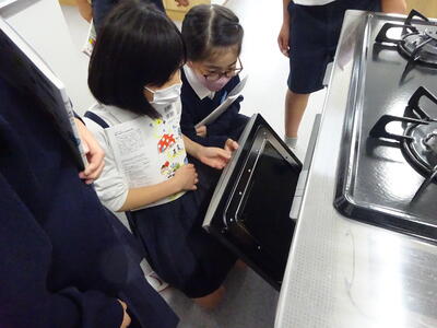 今日、3組の子ども達が調理室に初めて入り、見学会が行われていました。子ども達も様々な道具や器具に興味津々でした。