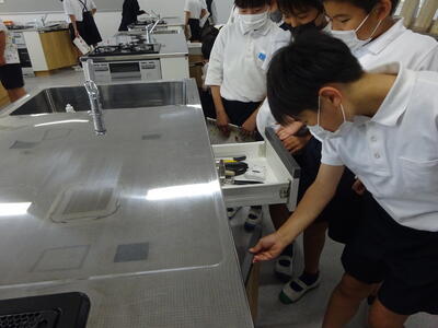 実習では、ミシンを使ったり、調理をしたりなども行い、子ども達にとっては楽しみな授業の一つです。楓の森小は、中学校も一緒のため、小学校にはあまりない「被服室」もあり、もう一つの「調理室」と使い分けながら授業を行うことができます。