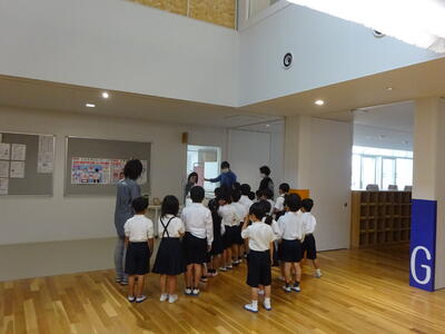 1年生は、生活科の学習「がっこうたんけん」がはじまりました。今日は、校舎の1階を各クラスでたんけんをしていました。保健室や職員室、校長室、事務室、技術室などをたんけんしました。職員室の入り方も練習しながらのたんけんです。色々な部屋をたんけんしながら、部屋のやくわりや先生の紹介などの説明を聞いていました。楓の森は、小・中同居のため、通常、小学校にない特別教室(技術室)や武道場などもあり、1年生にとってはワクワクするたんけんとなったのではと思います。来週は校舎2階のたんけんが予定させています。