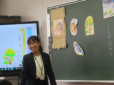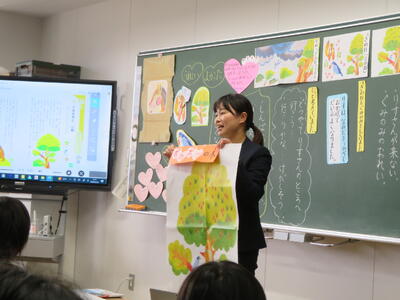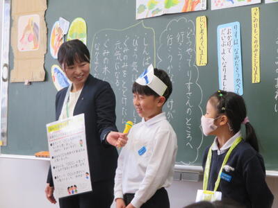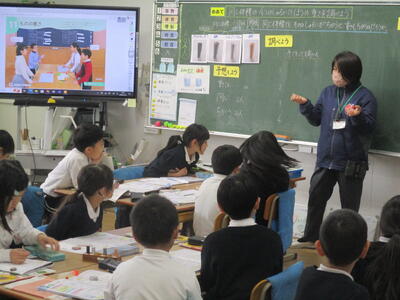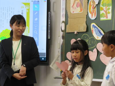2年1組の松岡先生が、主題名「親切のあたたかさ」教材名「ぐみの木と小鳥」の授業を提案しました。嵐の中、小鳥がぐみの実をりすに届けるお話ですが、役割演技等を通して、親切についてよく考え、最後は、「やさしさカード」で自分のことをじっくり振り返ることができました。子どもたちは、たくさんのお客様の参観で緊張したでしょうが、しっかり考え表現していて、すばらしかったです。たくさんのお褒めの言葉もいただきました。