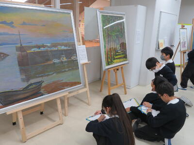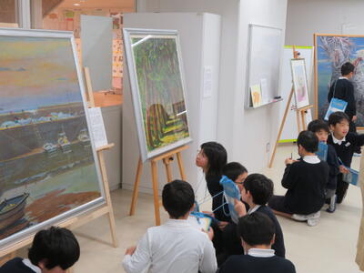 2月2日(月)から8日(日)までの日程で菊池恵風園絵画クラブ金陽会作品が開催中です。4年1組が鑑賞しているところにおじゃましてきました。お気に入りの絵の前でメモをとったり、キュレーターの藏座さんに絵の説明をしてもらったりして、本物の絵をじっくり楽しむ子どもたち・・・。いきいきとした子どもたちの表情が印象的でした。保護者の皆様や地域の皆様にもぜひみていただきたいすばらしい作品ばかりです。今週末は一般公開も予定されています。ぜひ、お越しください。会場:本校地域交流室 日時:2月8日(土)10:00~15:00、2月9日(日)10:00~14:00 (主幹教諭:濱坂 由紀美)