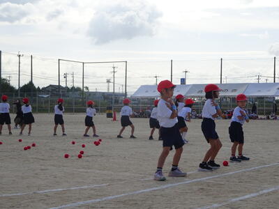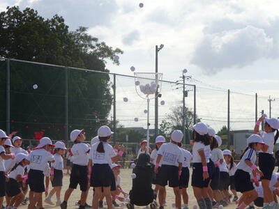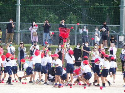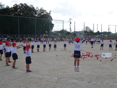 2種目は、団体「かごいっぱいになあれ」(玉入れ)です。1組から4組までそれぞれ玉入れのかごを円で囲み、まずは曲に合わせたダンスをみんなに披露。ノリノリの1年生のダンス、これまたとってもかわいくて、会場をほのぼのとした空気にしてくれました。見ていた6年生や4年生も思わず一緒に踊ってしまうほどでした。