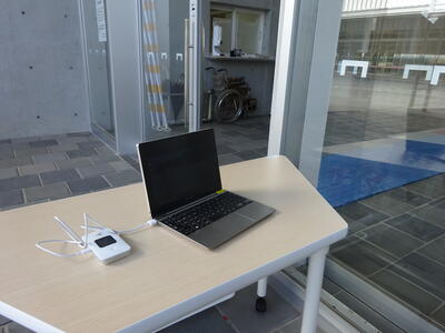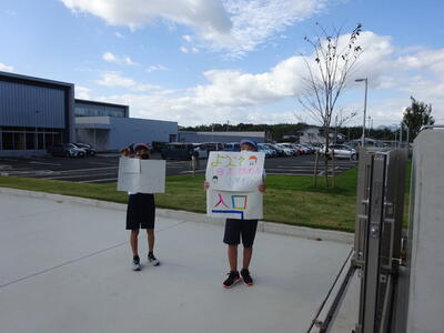 【保護者誘導】感染対策のための今回ならではの係。子ども達事前に看板を作成。「ようこそ楓の森小へ」「並んでお待ちください」「トイレはこちらです」「校舎側にお戻りください」「授乳室あります」「お気をつけてお帰りください ありがとうございました」などなど。最初は恥ずかしがっていましたが後半は声もでてました。