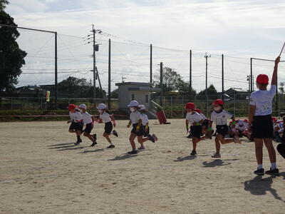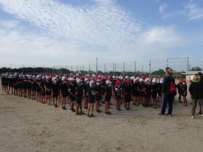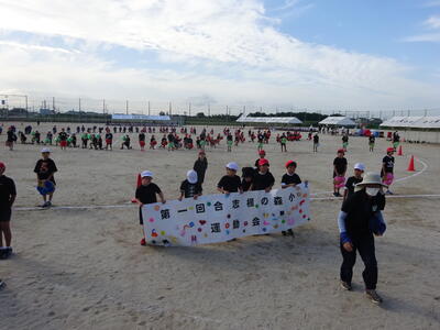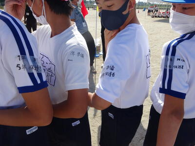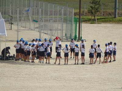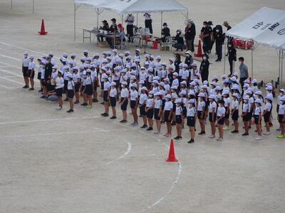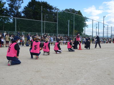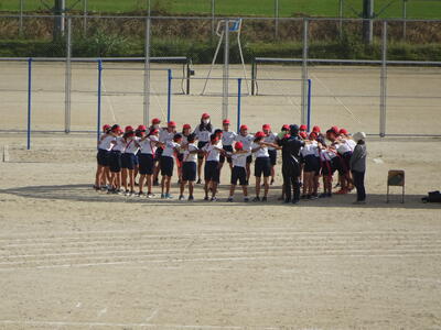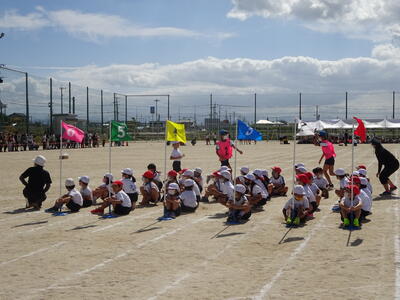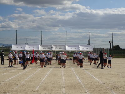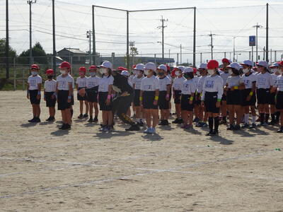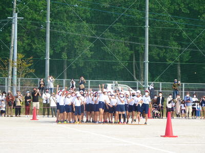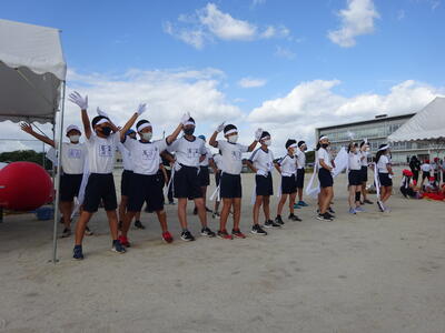 午前中の3番目は2年生。保護者の方と1年生・6年生が見守る中での競技です。リックサックに敷き物や予備マスク等を入れ、水筒を持ち、3年生の種目参観の準備もバッチリの2年生。校舎前で「がんばるぞ!」と気合いを入れ、いざ運動場へ。