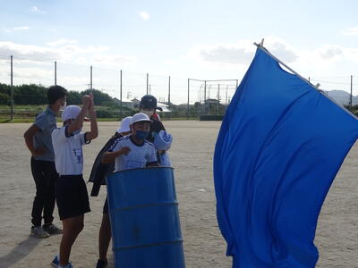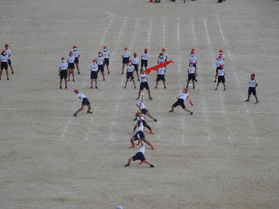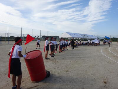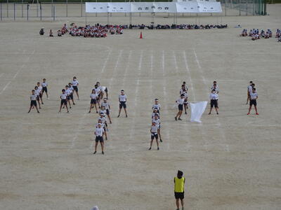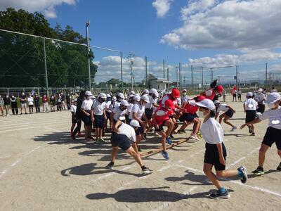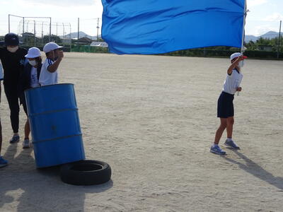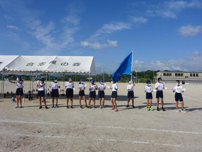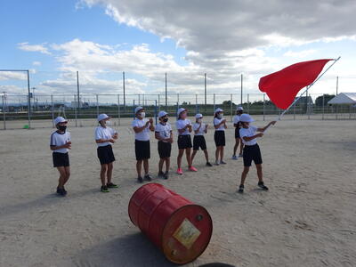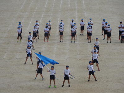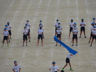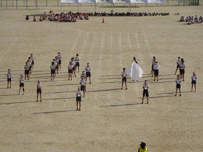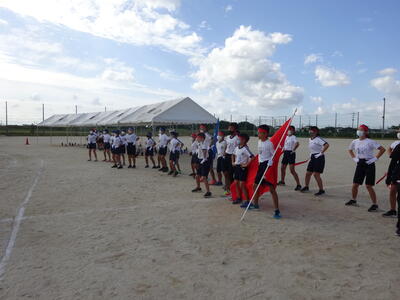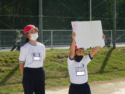 今回、全校での開会式はできなかったため6年生のみの競技開始宣言と各団長による選手宣誓を行い競技開始。6年生は団対抗戦で優勝旗を目指します。