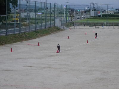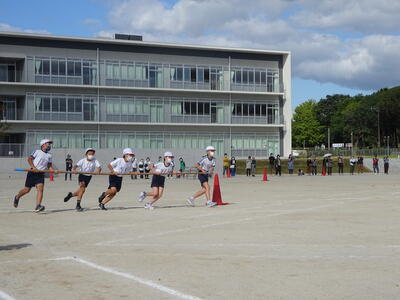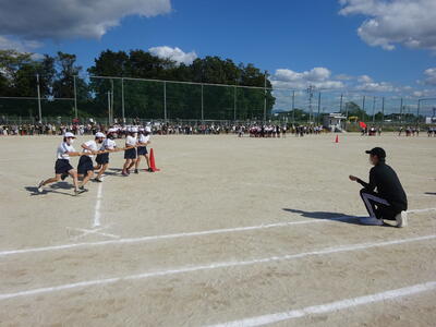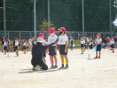 まずは、全員で元気にあいさつをして、50m走「まっすぐ!まっすぐ!」。みんな力強い走りでゴールに一直線。