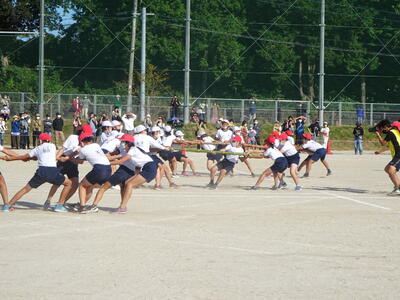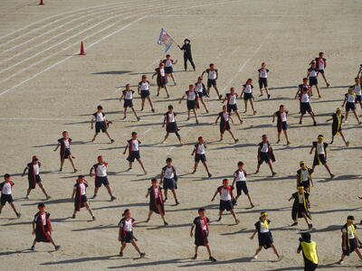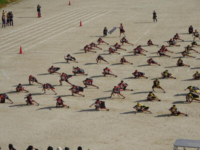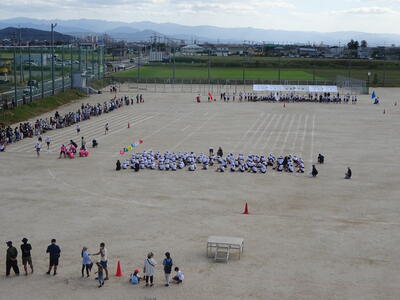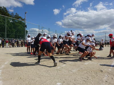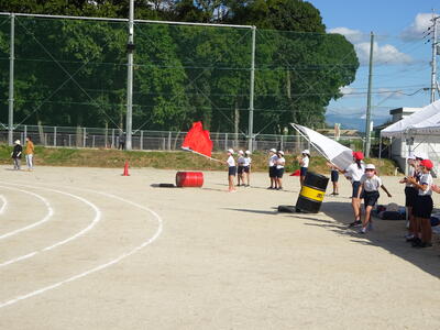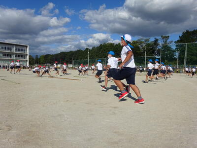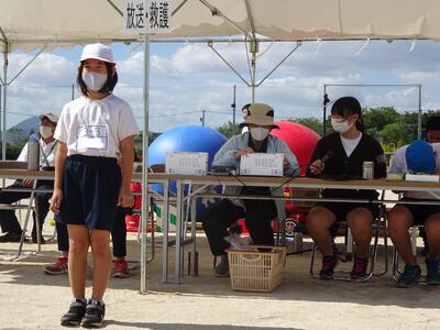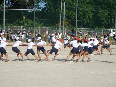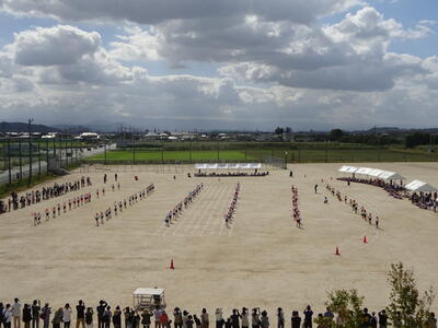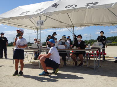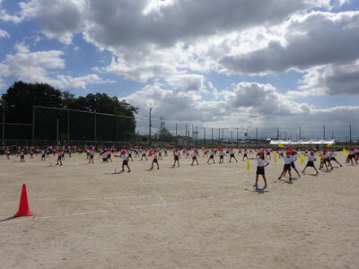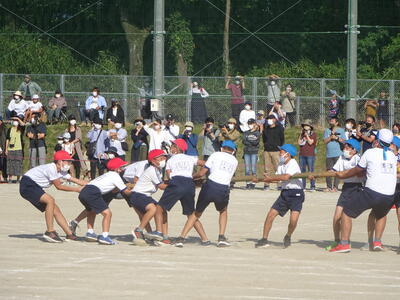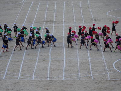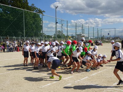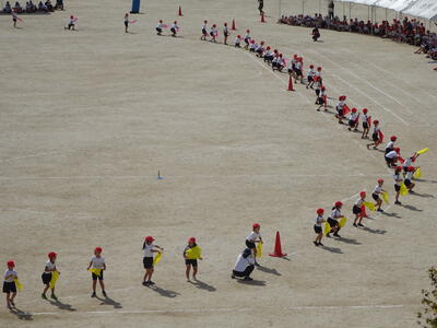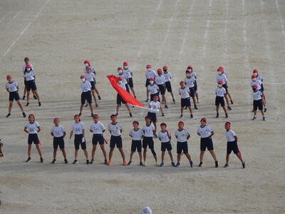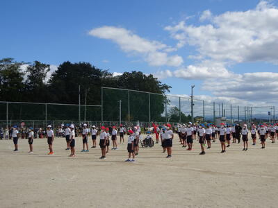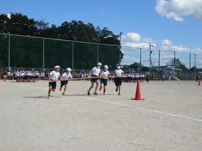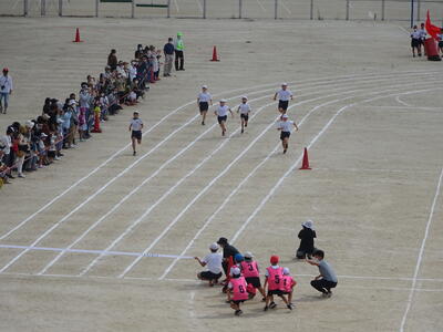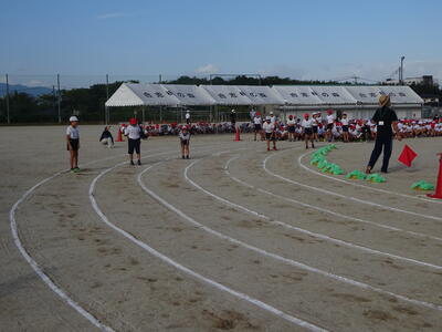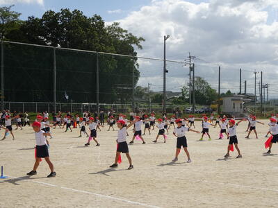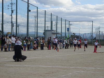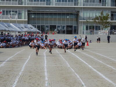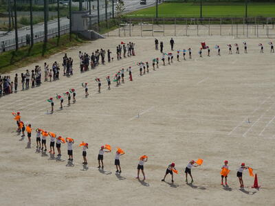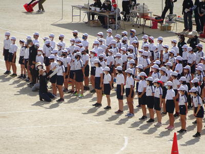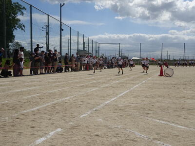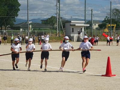 各学年2種目(6年生は4種目)で、4年生をスタートに1年生、2年生、3年生までが午前中に、午後から5年生と6年生がそれぞれ競技等を行いました。6年生は、朝から各学年の競技や演技を応援し、またスタートやゴール、道具の準備、放送などの係で各学年の裏方として運動会を支えてくれました。また、早朝からPTA役員の方々にも保護者受付や誘導などをしていだきました。