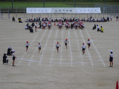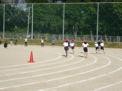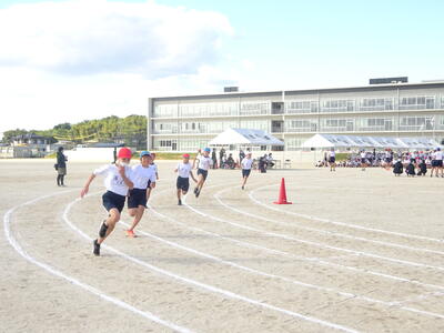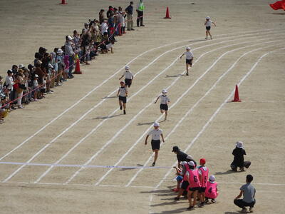 まずは徒競走「午後(5 GO!)に駆ける」(130m走)です。さすが高学年。セパレートコースを安定した走りで駆け抜けていきます。力強さも感じる走りです。