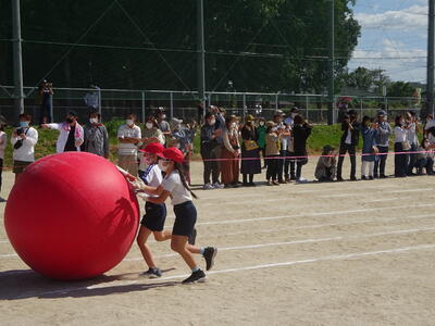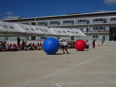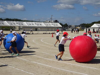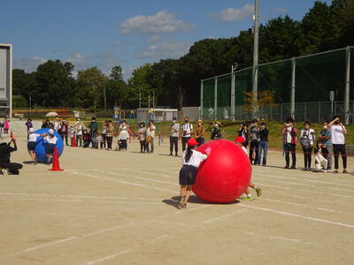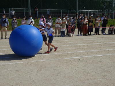 団体競技「力を合わせて コロコロコロ」は大玉転がしです。赤、青、白の大玉ころがしを一周200mのトラックを4組で約50mずつ転がしていきます。一組2人で転がしますが、競技の間、ちょうど東からの風が吹いていて、各組とも風とも闘いながらの大玉転がしとなりました。