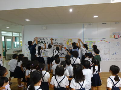 【企画委員会】大会スローガンを取りまとめ5年生企画委員を中心にスローガン看板を制作してくれました。
