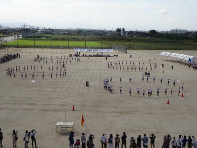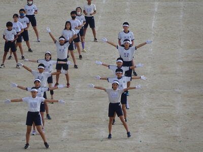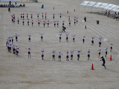 表現は「ドレミでダンス♪」。みんなが口ずさめるドレミの歌にのったダンス。この広い運動場での体形移動ができるのはすごい!数回しかてきなかった運動場練習の中でのこの動き、一人一人が考えて動く姿に、普段からの2年生のまとまりが感じられました。