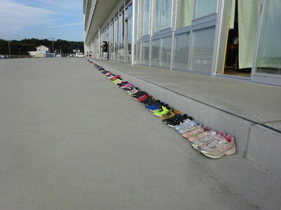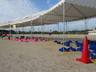 合志楓の森小学校開校の4月に入学した1年生。小学校初めての運動会は、保護者の方と4年生・6年生が見守る中で始まりました。オープニングの4年生が演技をしている間は、1年生は、教室で待機。その間に靴箱からベランダに靴を移動させ、いつでも運動場に行ける体制で準備万端の1年生。この半年ですっかり小学校生活も板につき、運動場の待機テントでの待ち方もバッチリ!!その成長ぶりに目が潤んできます。