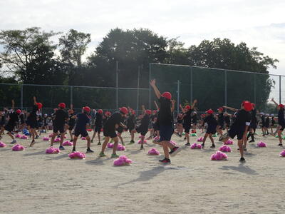 楽しいノリノリのダンスの途中で曲が止まり、一気に玉入れモードに切り替える1年生。ダンスから玉入れへとメリハリのある団体競技です。数回のダンスと玉入れで50個を超える組もあるほど1年生みんな頑張りました。