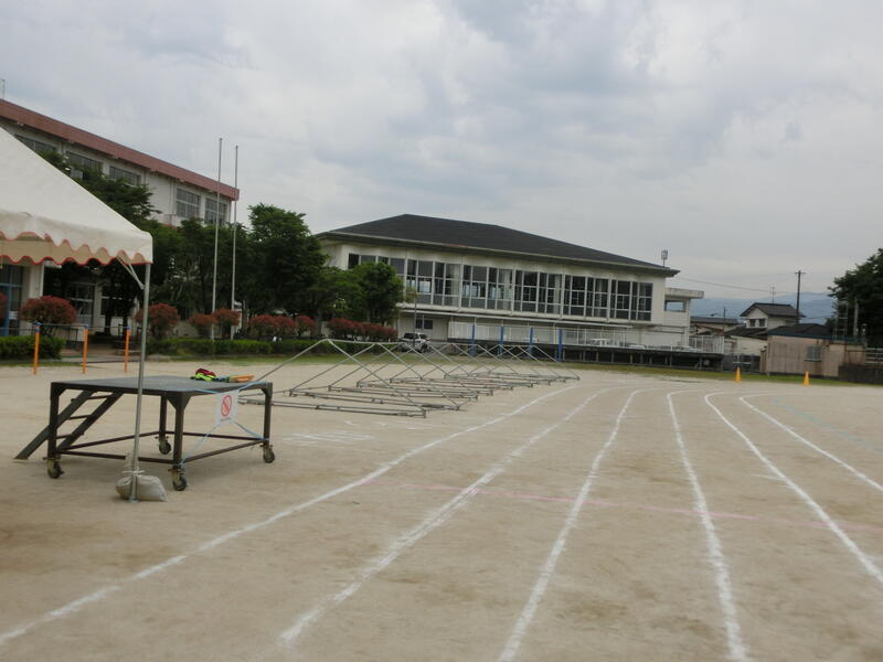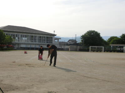 早朝から、先生たちが運動場のラインを引いていました。見えないところで、先生たちもがんばっています。運動会当日までの期間が短いので、先生たちも集中、協力して準備を進めています。