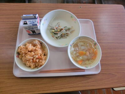 今日の給食のメニューです。五目うどんはおだしが効いていて、ひじきごはんはやさしい味付けで、とてもおいしかったです。かみかみサラダには、炒り大豆が入っていて、カリカリッとした歯ごたえがなんとも楽しい一品でした。
