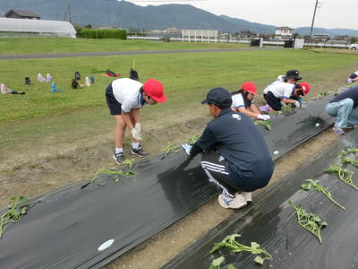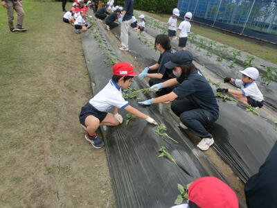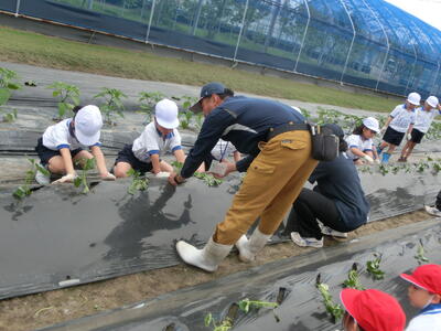 今日は、八代農業高校の先生方、生徒さんにご協力いただき、2年生がピーマンの苗植えをしました。急に気温が上がり、雨上がりということもあって、じっとりと暑い日となり、子供たちは汗をかきかき、ピーマンを植えました。八代農業高校のおにいさん、おねえさんがとてもやさしく植え方を教えてくれました。とても楽しい時間となりました。