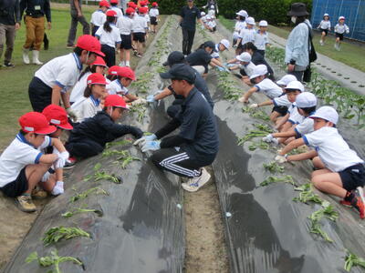 今日は、1年生が、八代農業高校の生徒さんと一緒に、いもの苗植えをしました。先日も書きましたが、八代農業高校さんには、高校生と小学生の交流及び体験学習で大変お世話になっています。本当にありがたいことです。1年生も、高校生のおにいさん、おねえさんと一緒に活動するのをとても楽しみにしていました。