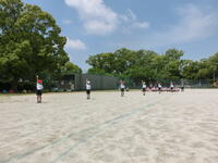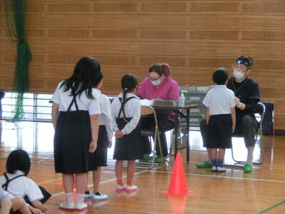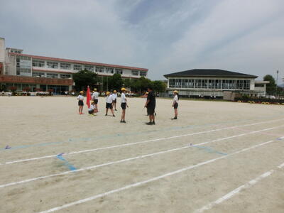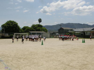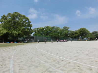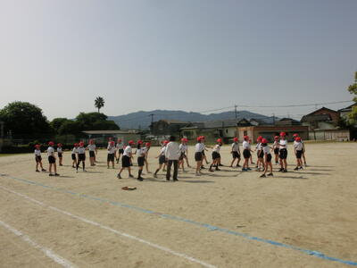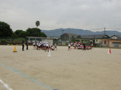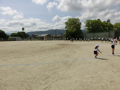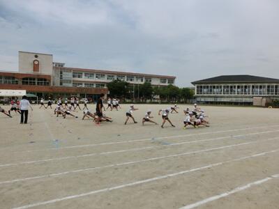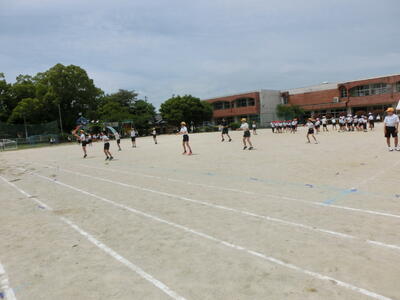 5年生の体育の様子です。リレーのバトンパスを練習していました。「はいっ」「はいっ」元気な声が運動場に響き、とても気持ちのよい一コマでした。