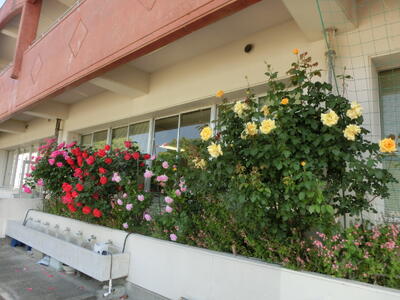 職員室前のバラがとてもきれいに咲いています。鏡小は花がいっぱいでとてもきれいです。