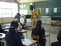 コロナ禍の中、Zoomで鏡中学校とつなぎ、鏡中学校の先輩のお話を聞いたり、質問したりしました。