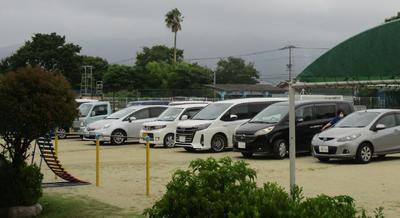 運動場に整然と並ぶお迎えの車。保護者の皆様のご協力 ありがとうございました。