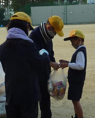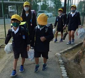 たくさんの子供たちが アルミ缶を手に登校しました。