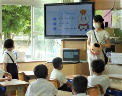 1年生は、歯の王様について勉強し、きれいに磨く方法を保健室の先生から教えていただきました。