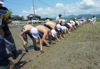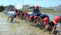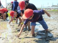 5年生は、八代農業高校の田んぼで田植えをしました。苗も田んぼも八代農業高校の生徒さんと先生方が準備してくださいました。みんな、にこにこ笑顔でした。