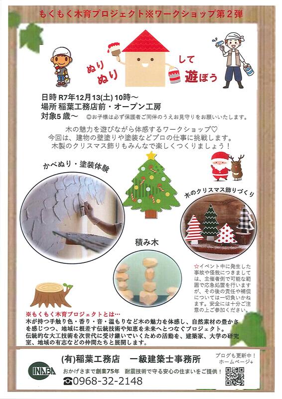 稲葉工務店様から、ワークショップのご案内をいただきました。木のぬくもりに触れて楽しむことのできるオープン工房の建物のかべぬり、塗装体験や、木製のクリスマス飾りづくりなどができるそうです。場所は、稲葉工務店の前です。家族や友だちと一緒に体験に行ってみませんか?