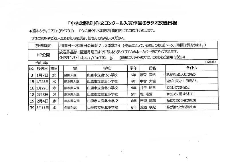 「小さな親切」作文コンクール入賞作品が、ラジオで放送されます。鹿北小児童5名の作品が、全国入賞、熊本県入選に選ばれました!ラジオ放送の日時は、下記のとおりです。ラジオ放送を聞き逃しても、熊本シティエフエムのホームページにアップされますので、そこからも聞くことができます。心温まる素敵な作文ばかりです。ぜひ聞いてください。